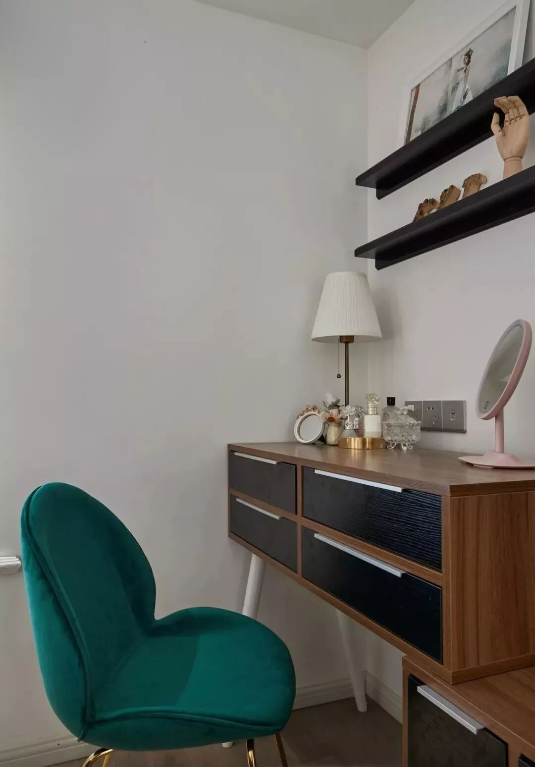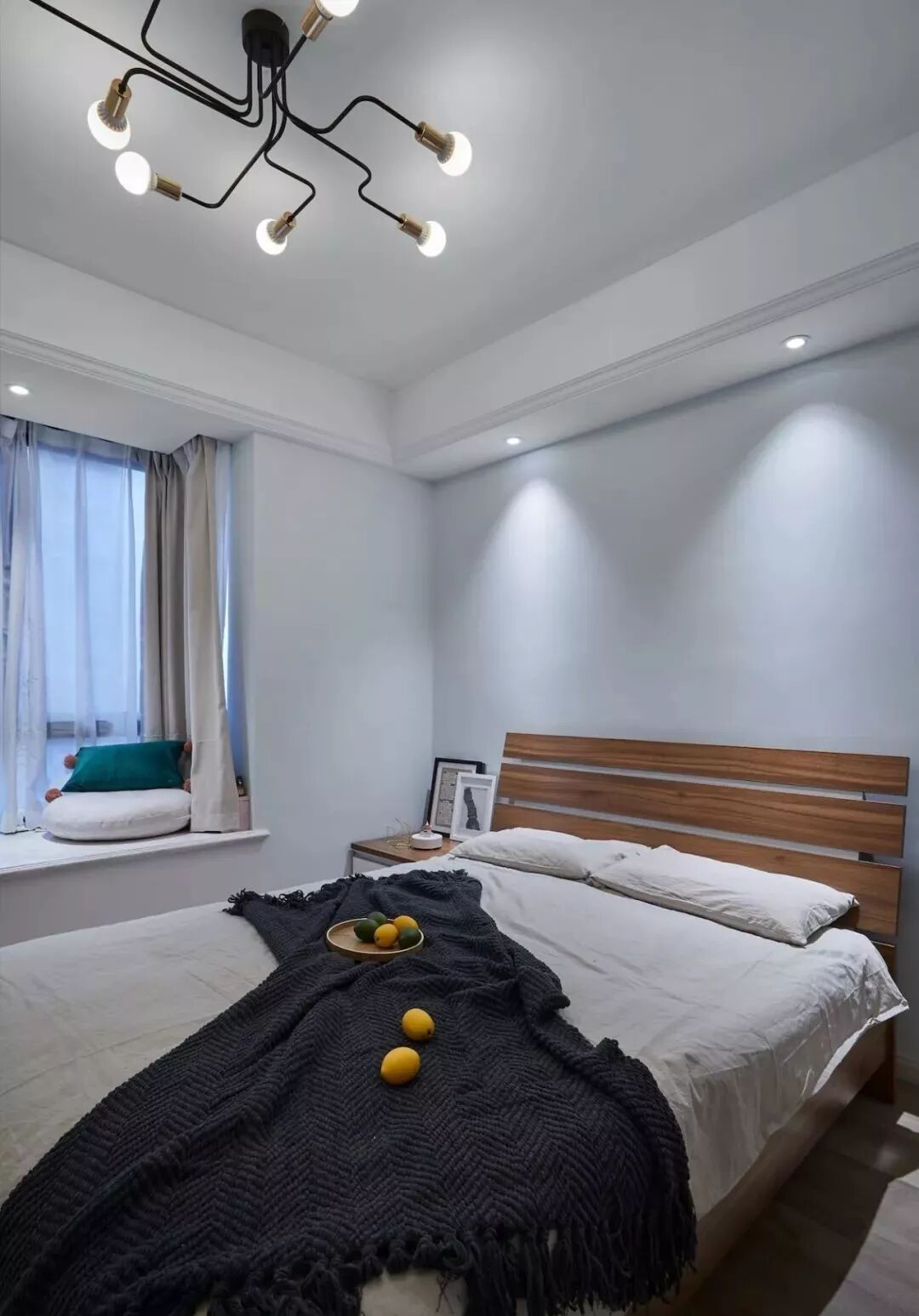 ▲ 次卧风格低调简洁,整体延续灰色主义,木色家具搭配白色床品,简洁舒适