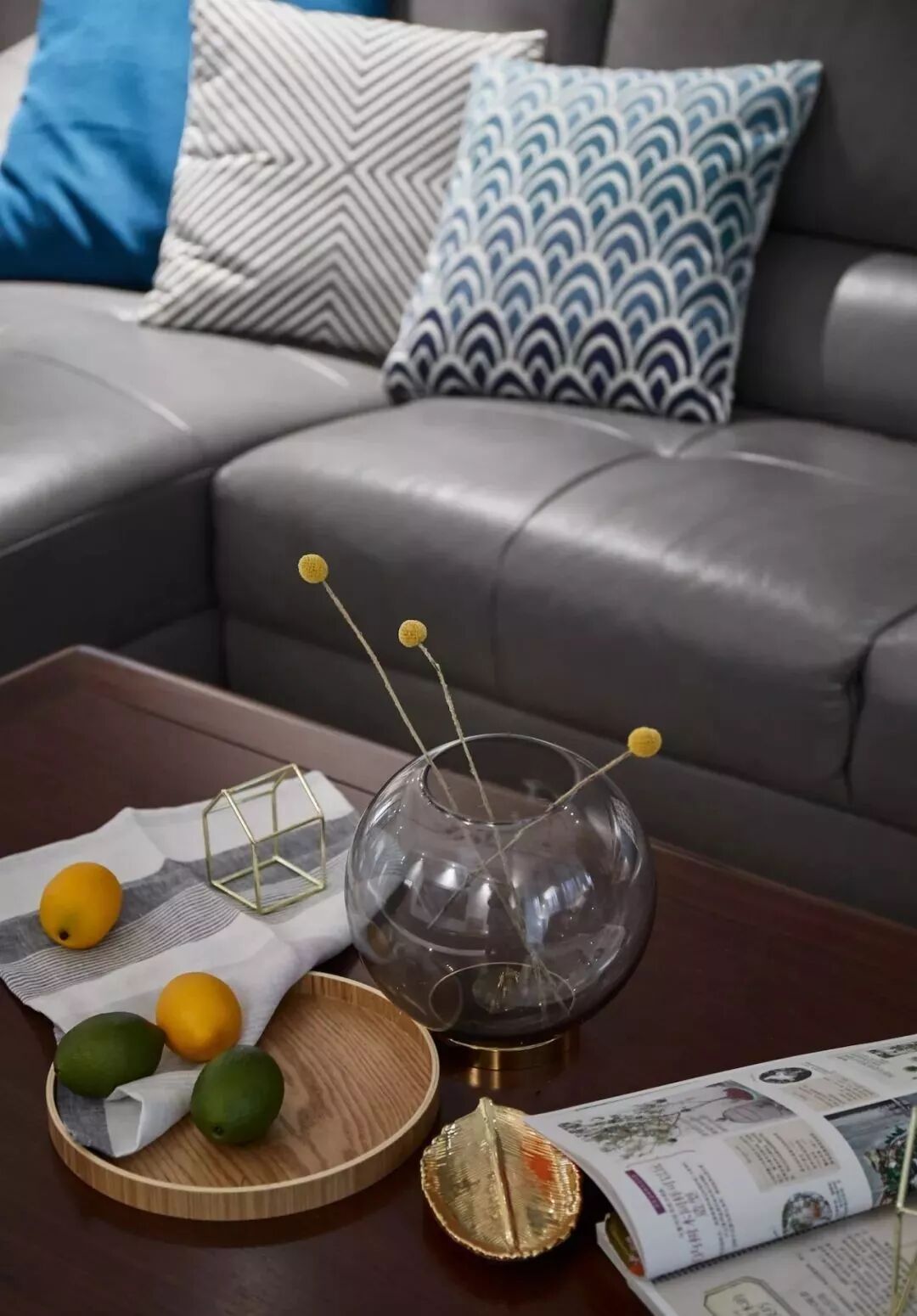 ▲ 蓝色软装搭配让整个空间将冷淡高级灰应用到极致