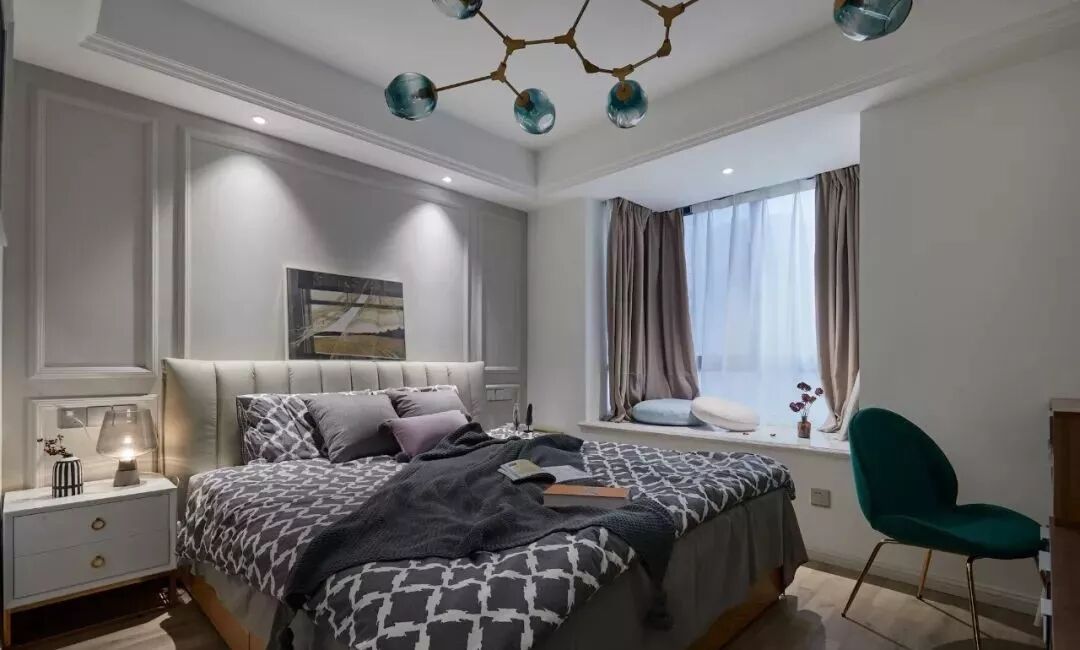 ▲ 主卧木色与灰白色搭配,石膏线勾勒背景造型,舒适大床,蓝色吊灯与单椅,整个卧室风格高度一致