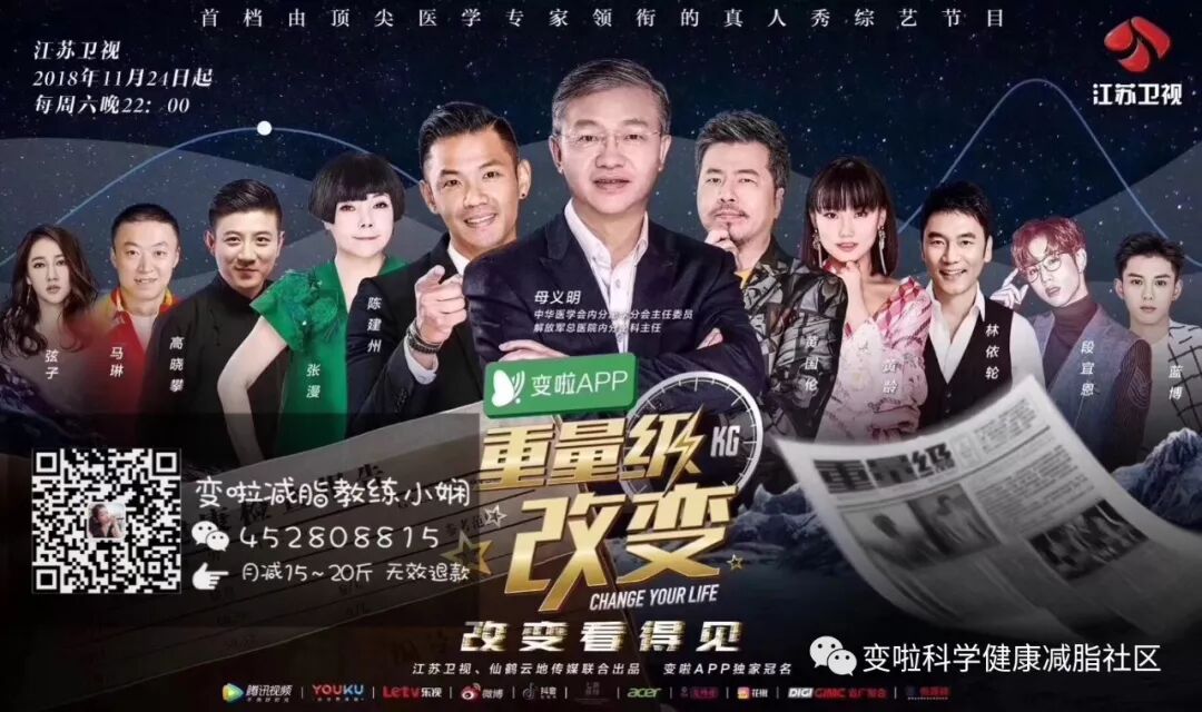 另外由变啦独家策划和冠名的全球首档减脂真人秀自2018年11月24日起,每周六晚10点在江苏卫视播出《重量级改变》