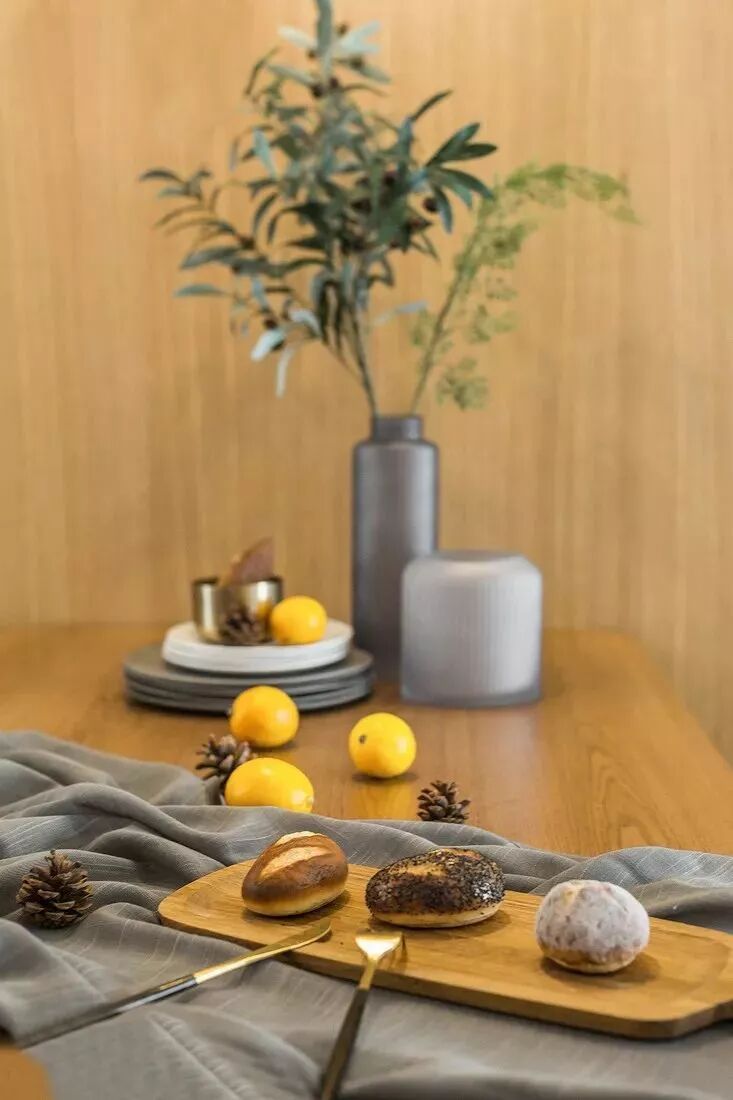 ▲ 灰色系的餐具为木色空间注入一丝宁静,低调有质感。