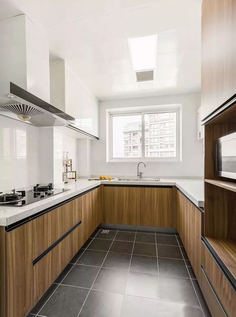 ▲ 厨房木色的橱柜柔和朴实,选择了U型设计,扩大了操作空间,使厨房空间得到最大化的利用。