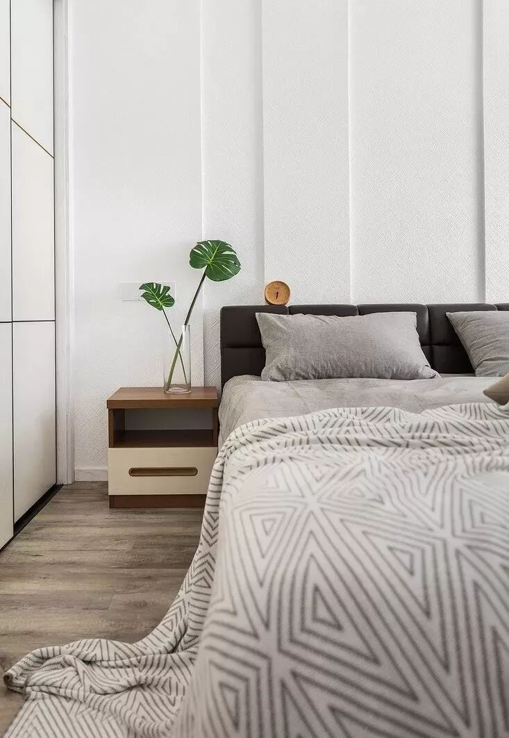 ▲ 主卧白色墙面配以黑色皮质床靠背,简洁明了。