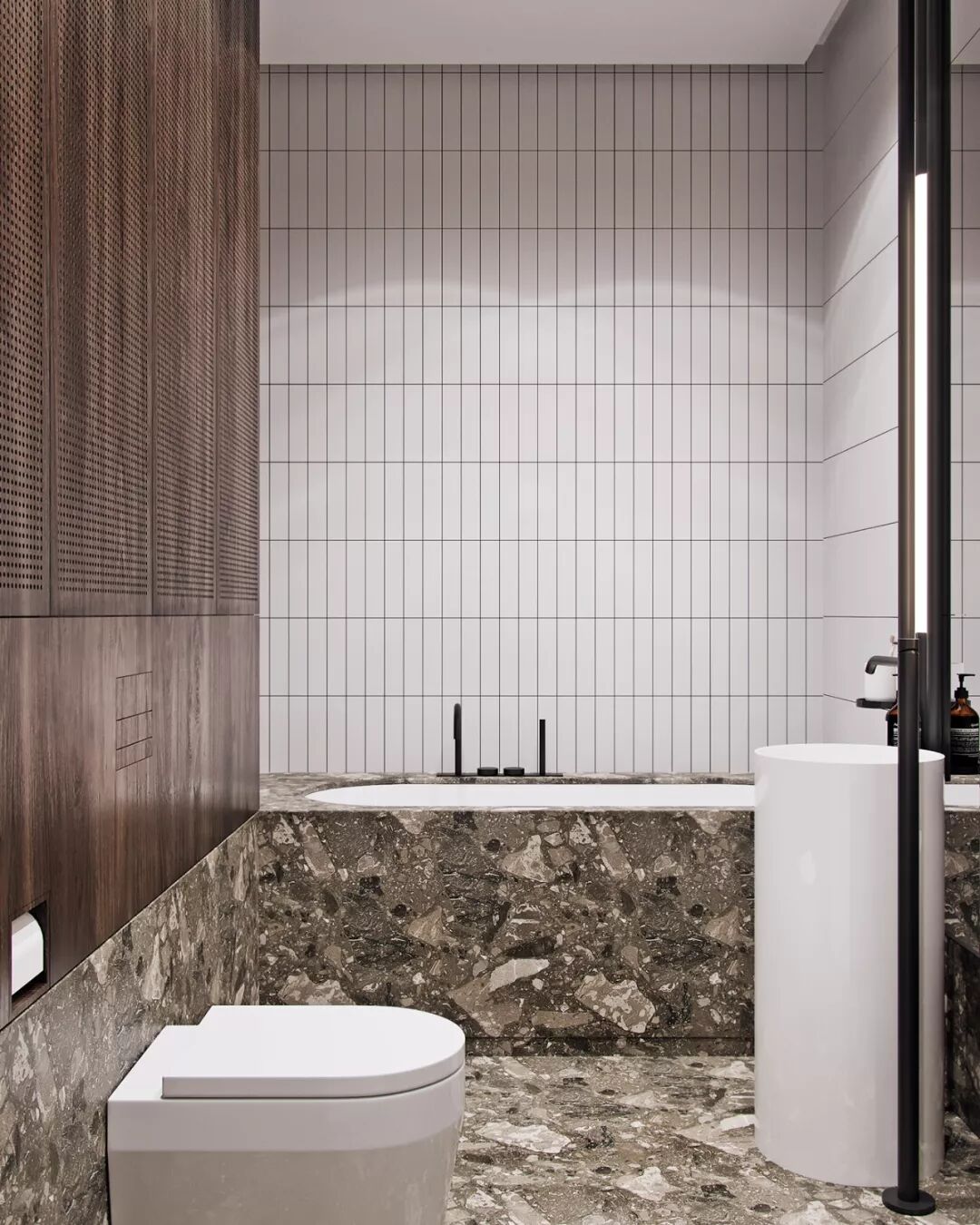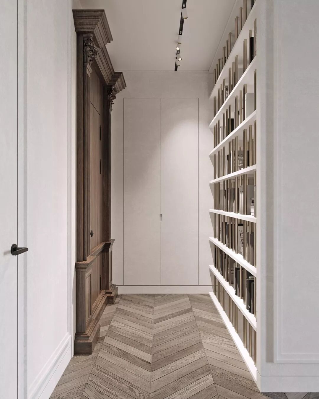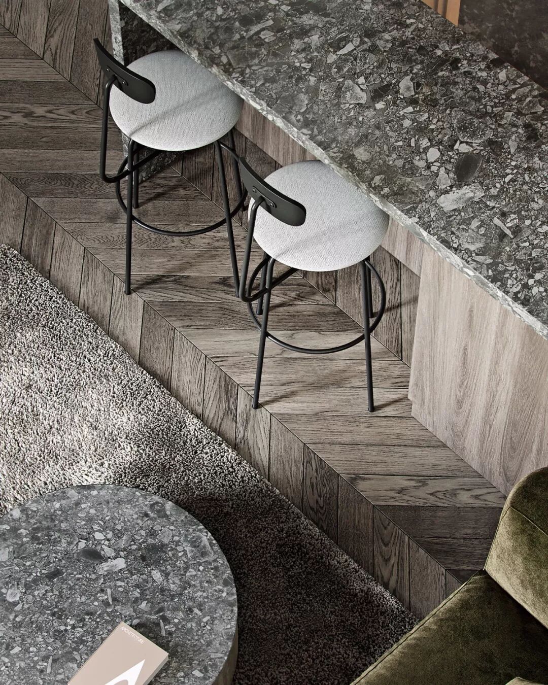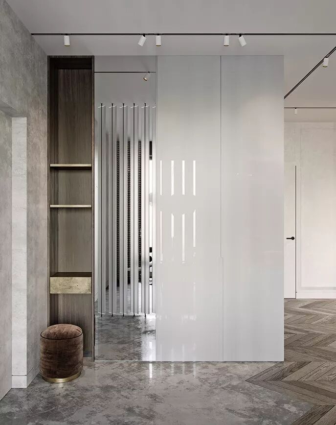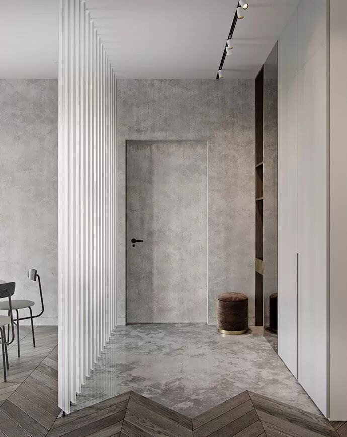 门厅地面采用木纹砖和石纹砖拼贴设计,