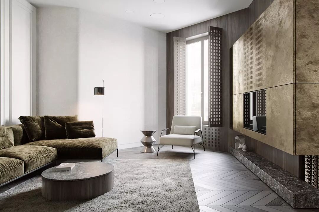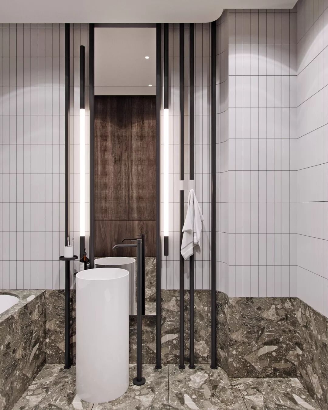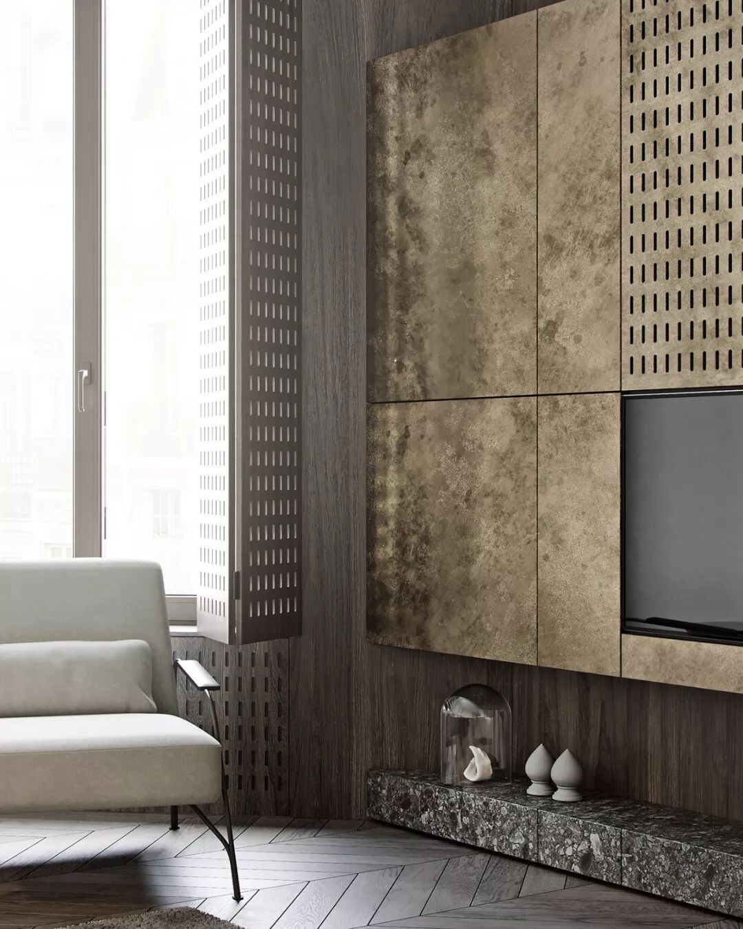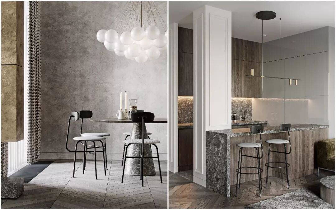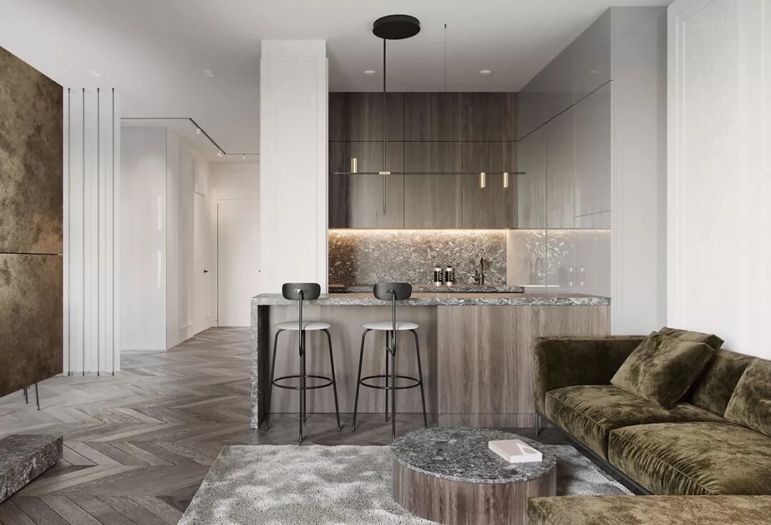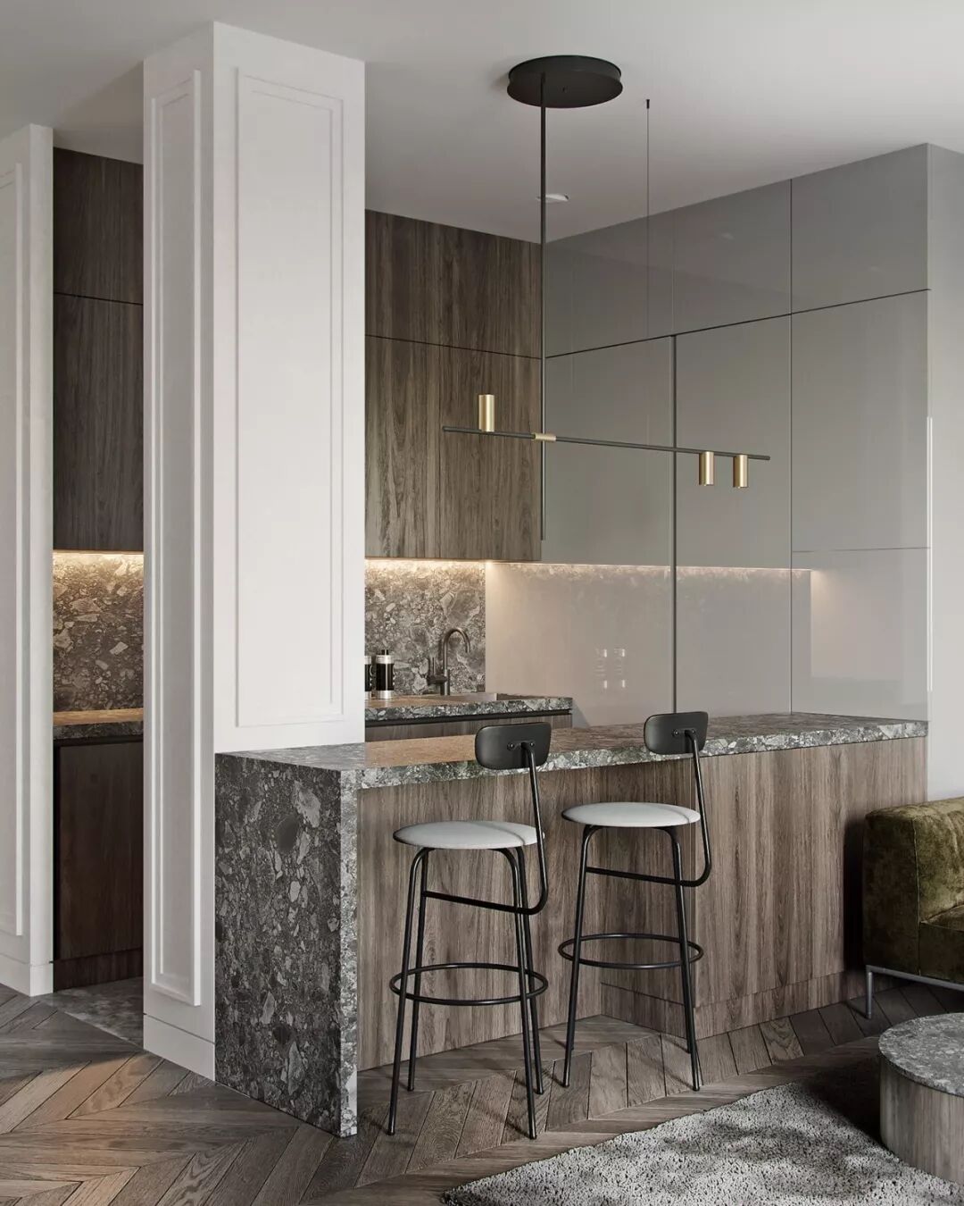 门厅地面采用木纹砖和石纹砖拼贴设计,