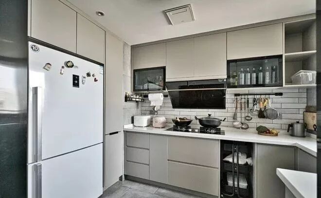 U型厨房,地柜、吊柜、高柜多元组合设计,根据电器位置,使用习惯,定制尺寸,使用起来更加得心应手。