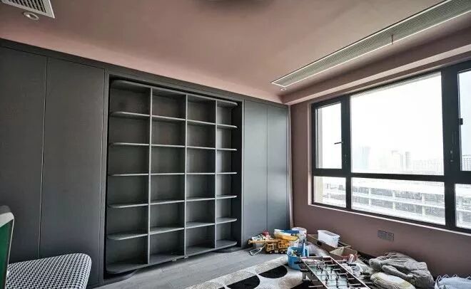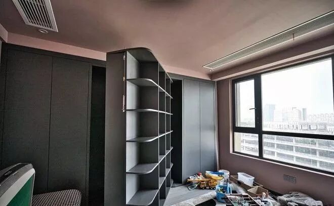 通过其中一间隐形门,进入书房(暂作儿童活动空间),延续将过道的粉色用在了墙面,柜体的设计则选用了高级灰色,形成鲜明对比。