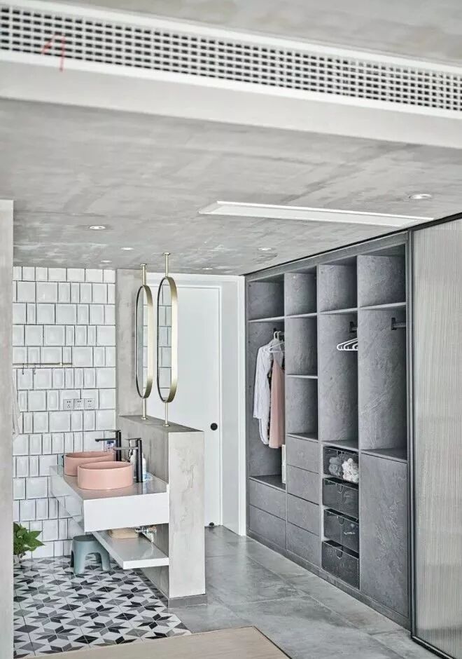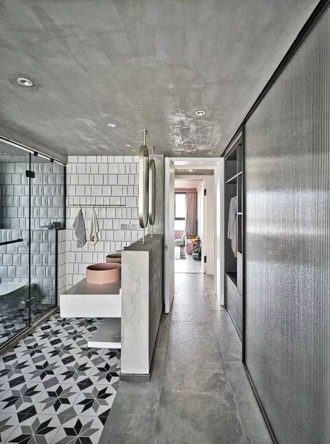 干湿分离的卫生间将洗漱台面设计在一个开放空间,水泥灰台面,珊瑚粉台盆,再加上上方两面金属框椭圆形镜子,颜值超高!