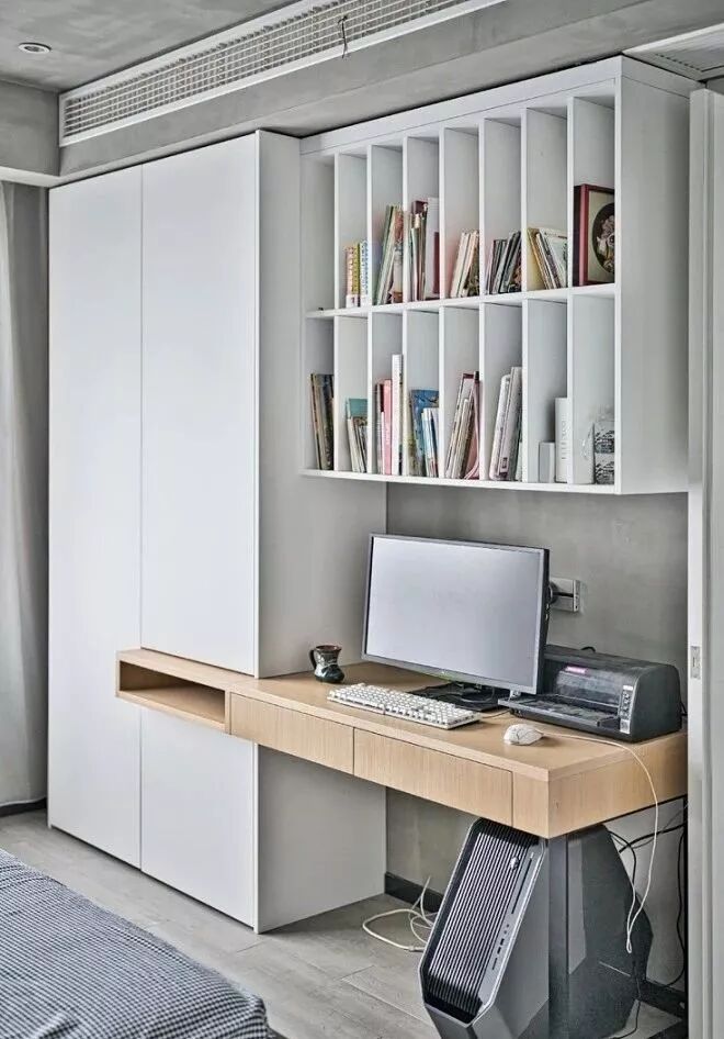 两侧铺满内嵌式柜体,简约线条性设计,配铣型拉手,定制的书桌,拥有独特的设计感造型,在简约之中创造不同。