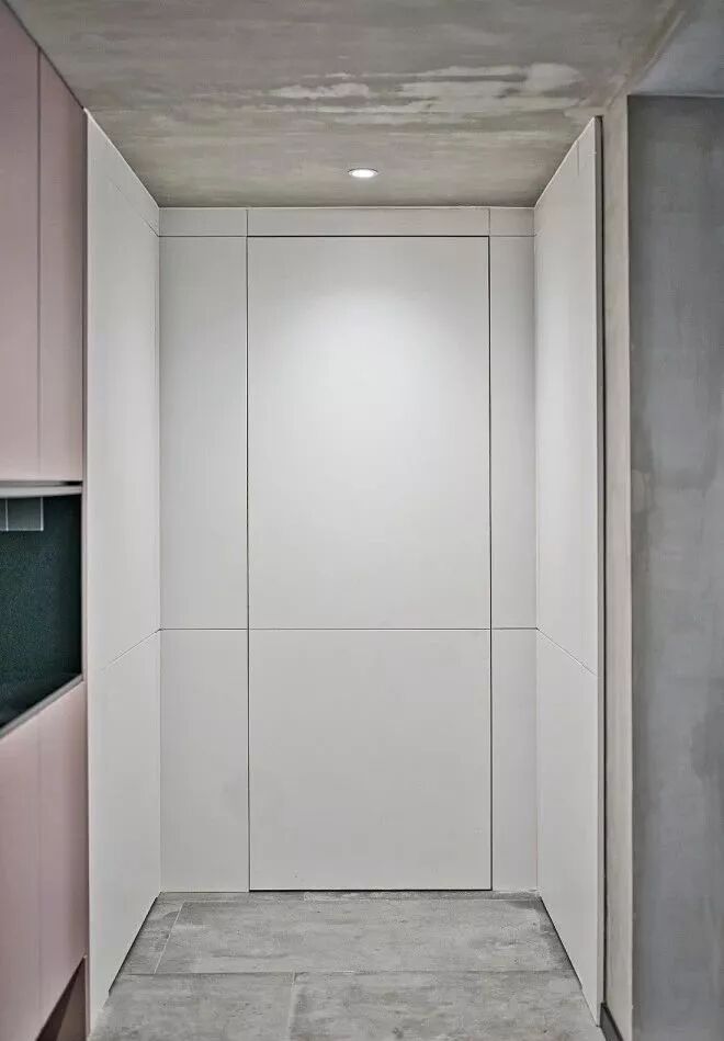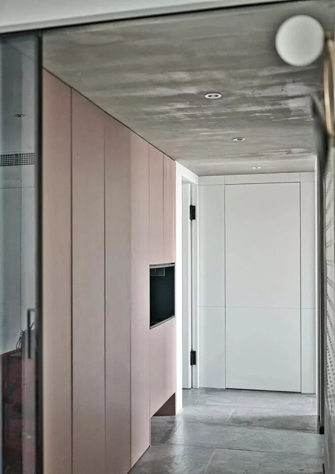 通过客厅的另一扇移门可通向书房,过道充分利用起来,设计一排储藏柜,选用甜美温柔的粉色,与灰色墙面搭配,打造出独属的时尚感。
