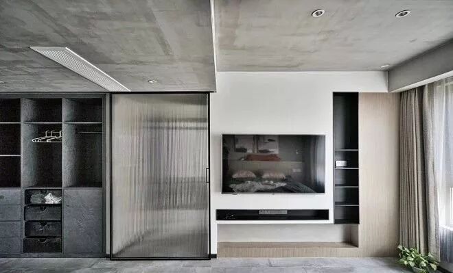 通透的黑框玻璃衣柜,嵌入水泥灰墙面,打造出业主想要后现代简约美。