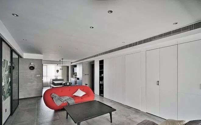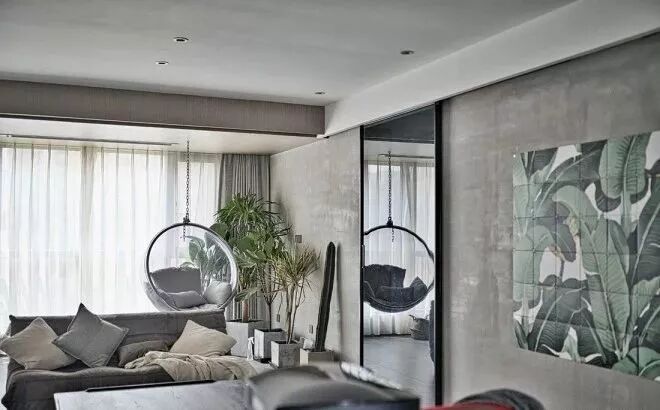 客厅另一侧墙面为水泥灰色,并设有两组对称吊轨黑玻移门,超长轨道设计,完美将功能性与美观性结合,避开了传统门带来的厚重感,更加现代。