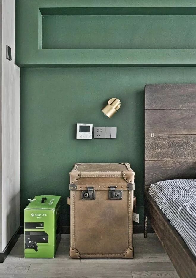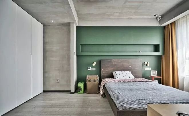 除却水泥灰,床头墙面选择了健康有力的橄榄绿,是生命力的彰显。