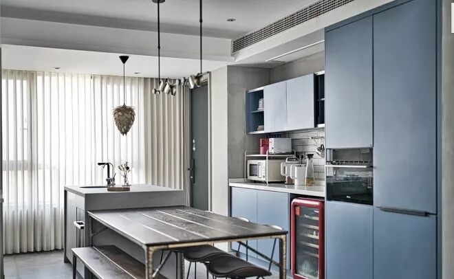 侧边定制蓝色餐边柜,满足电器、器皿收纳整理。