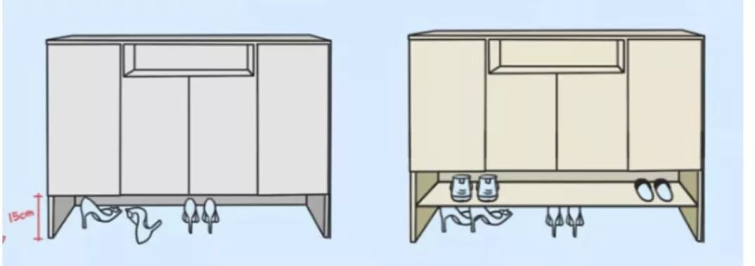 不想门口一堆拖鞋,还要每天弯腰开门找鞋的话,一定要在柜子底部悬空100~150mm的位置,一层不够可以做两层,满足常用鞋子的收纳。