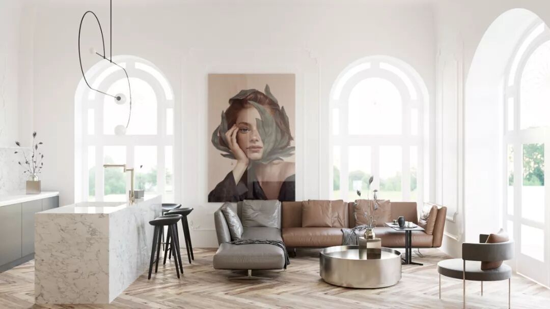 只需要改变一下思维,打破传统,以造型流畅,色调舒缓的小体量沙发,外加不同颜色的造型座椅替代,让空间看起来既时尚又精致!