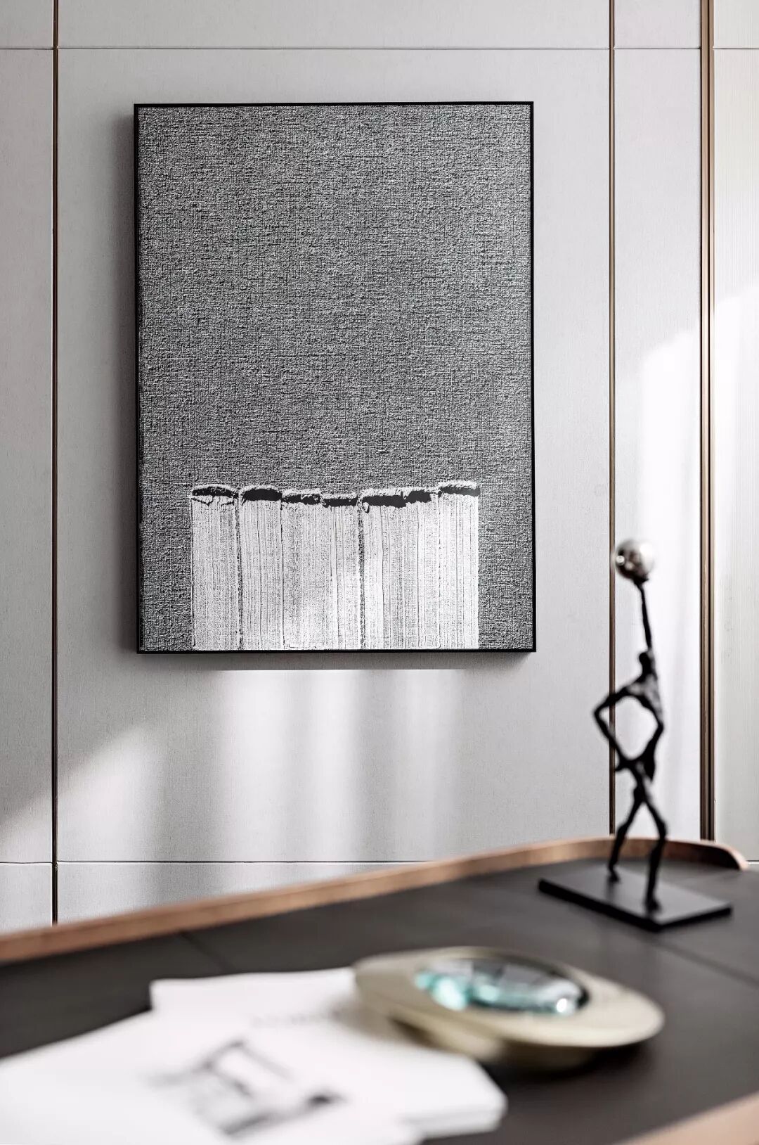 本案空间以大都会·时尚曼哈顿为创作灵感,秉承简约的灵魂,融入艺术时尚的设计元素,创造一个极具理性的空间。空间造型较为简洁,极力体现功能性与艺术性的有机结合,营造时尚沉稳的空间视感。注重于画面的精神性、颜料的质、色彩的意味以及形的简约和力度,试图传达一种属于当代的精妙“都市”风尚,塑造更阔绰而富有质感的集工作、生活与社交的场所,带给观赏者全新的审美体验。