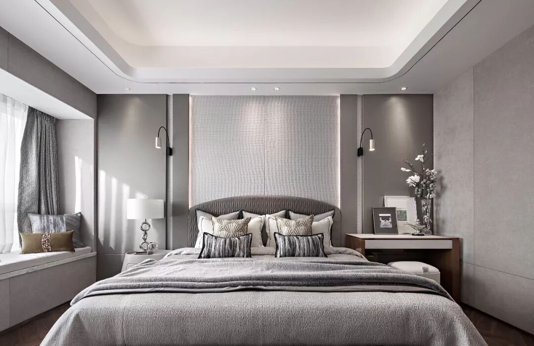由大面积单色或素净颜色的材质打造的卧室随处散发着平和之感,其重点在于空间陈设的舒适性和配色的沉稳。麻灰色长榻凸显空间的怡人尺度,细腻的装饰让空间散发雅致韵味,既奢华又低调。