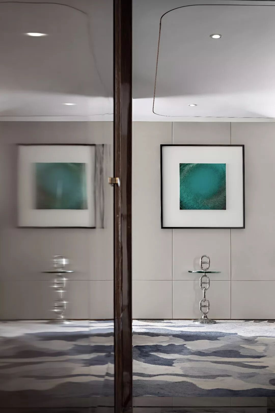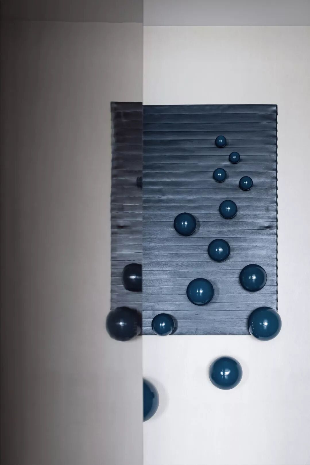 特别设计的蓝色现代雕塑由环氧树脂和有机颜料制成,看着这些似乎会自由移动的球体阵列,犹如看似永恒却又变幻莫测的星体,散发诡异又迷幻的质感,为空间注入一丝天马行空的想像力。