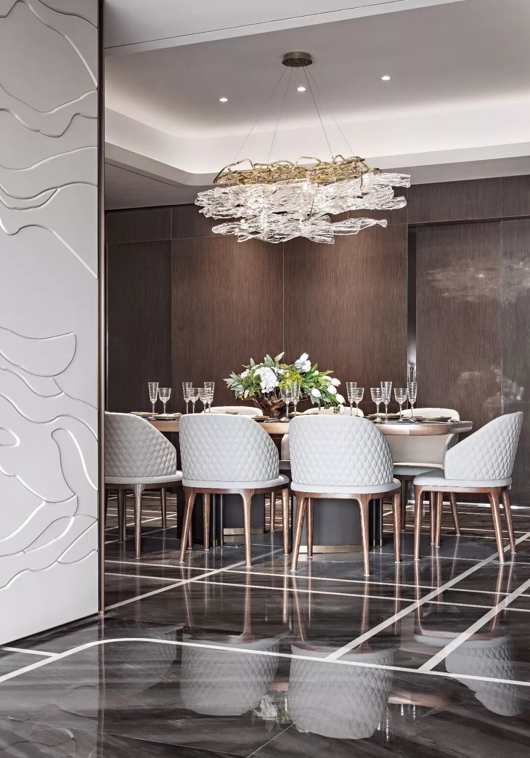 餐厅家具的造型多采用流线型设计,看起来简约时尚而富有质感,自由形态的通透吊灯更让空间显得流光溢彩。置身于美仑美奂的精美食物与撩人心弦的音乐之间,以极致化的生活体验愉悦家人……成为最纯粹的都会生活写照。