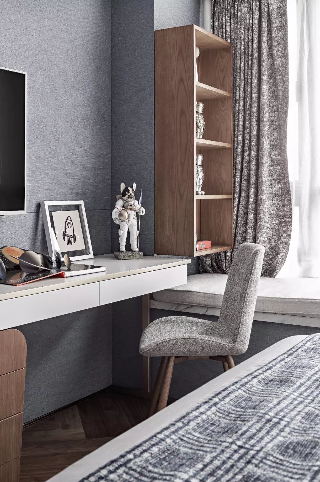 从踏进这个空间的那一刻开始,观赏者便被拽入小主人天真烂漫的奇想宇宙里,卧室结合了大量灰色而显得低调、温驯许多,却也能从充满太空感的小巧摆件感受来自另一次元的趣味与活力。