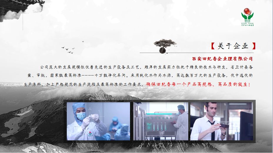 公司生产基地坐落于陕西省西安市秦岭生态保护区内,田纪香纯植物萃取,不对当地环境造成任何污染,这也彰显了一个企业的良心。