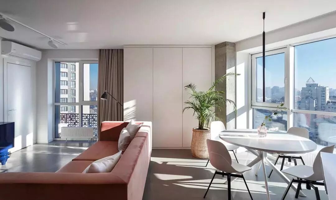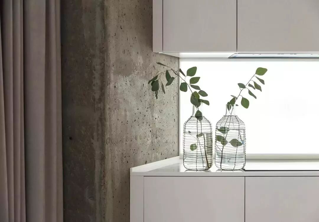 ▲两侧窗边的是水泥质感的墙体,结合上两瓶插枝绿意,粗犷的质感更是充满了自然年轻的气息。