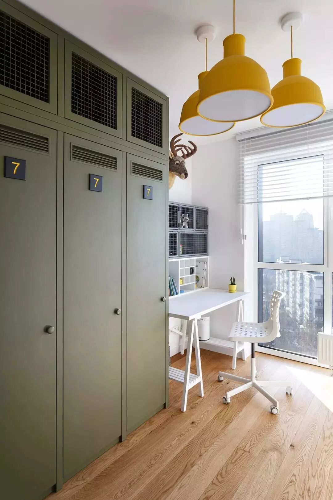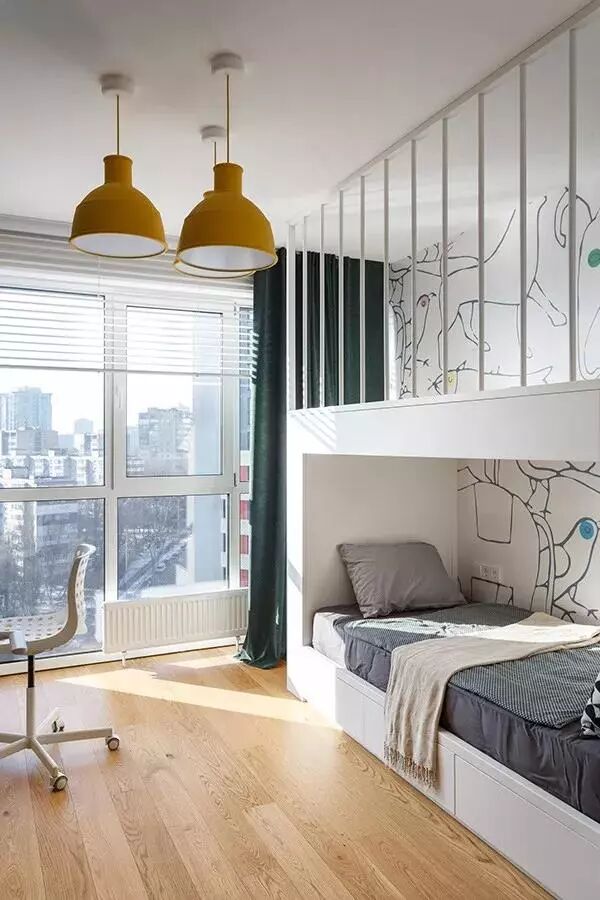 ▲绿色衣柜与红色吊灯,也为空间增添了几份活力感,靠窗再布置一张小书桌,为孩子提供了个舒适大方的作业看书的空间。