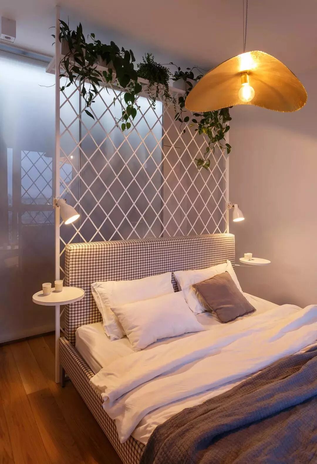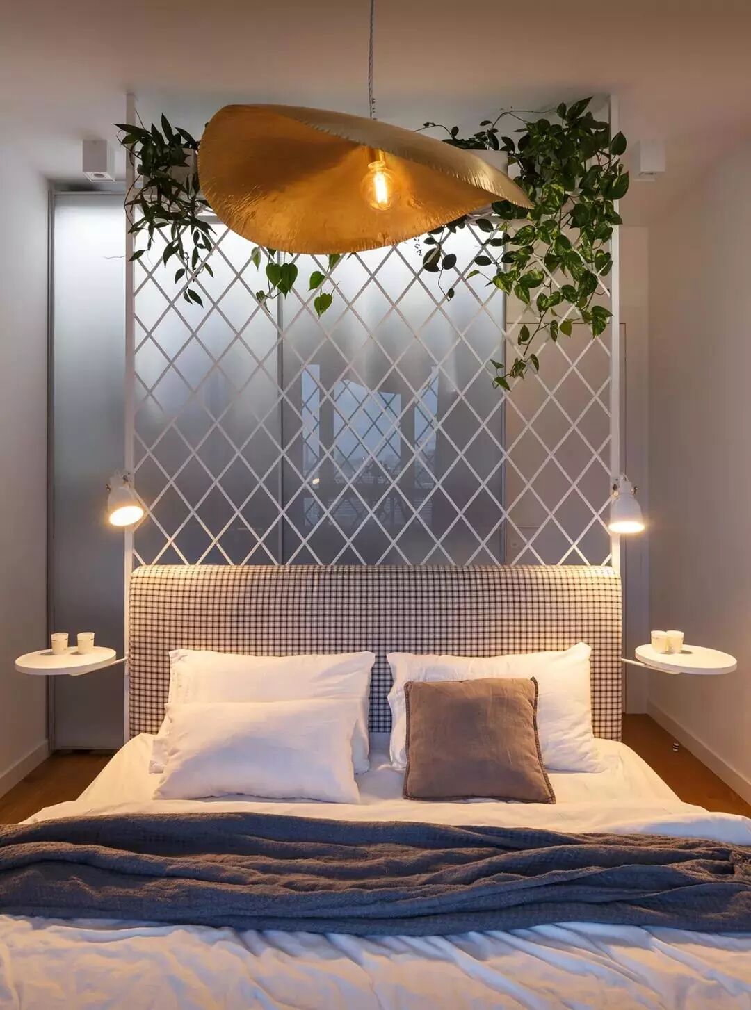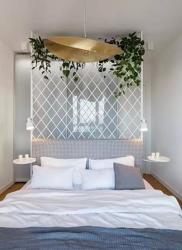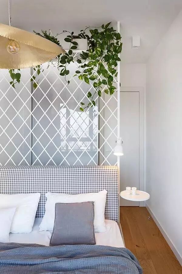 ▲主卧床头是白色铁艺架,挂上绿植后充满了自然的田园气息。