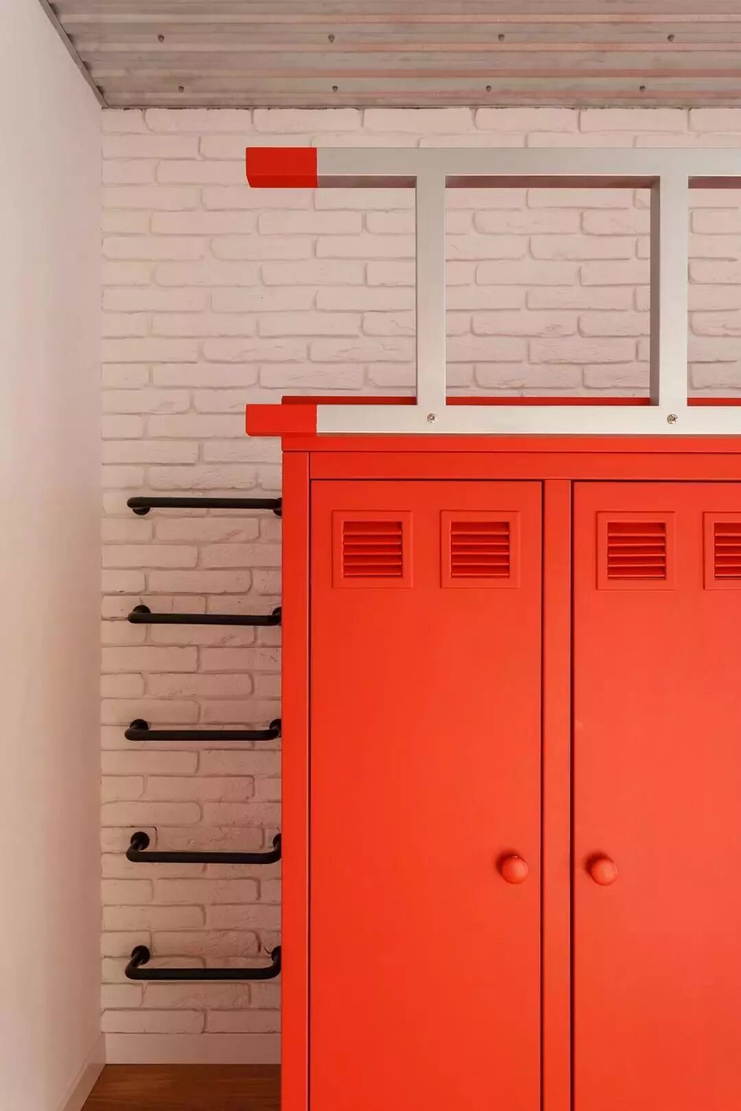 ▲文化砖墙面基础,装上一列的铁艺攀登架上床顶,为孩子提供了个有趣的儿童空间。