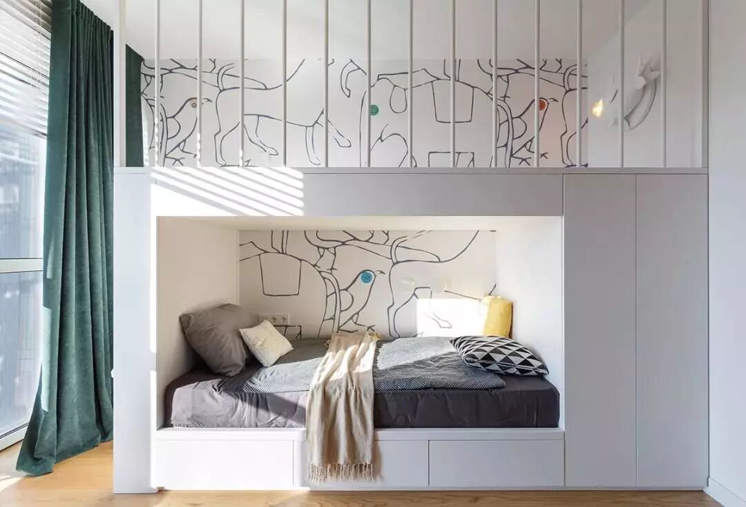 ▲儿童房的床上方还是个不错的儿童玩耍区,装上铁艺护栏后为孩子提供了个安全有趣的小世界。