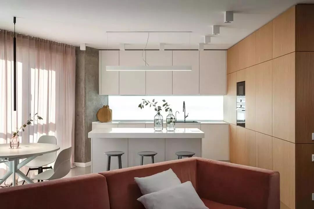▲沙发后方的是餐厅与开放式厨房区域,空间简洁明亮的灯光布置,带来了一个优雅情趣的餐厨区。