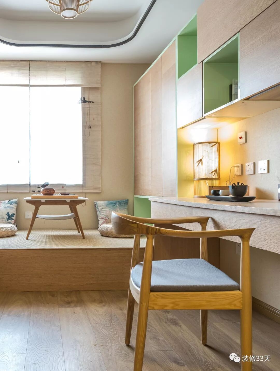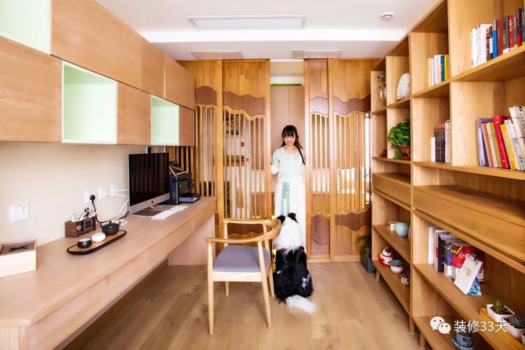 ▲ 木质大面积储物柜与书架,并在靠窗位置木作榻榻米茶室,兼具书房与客卧功能