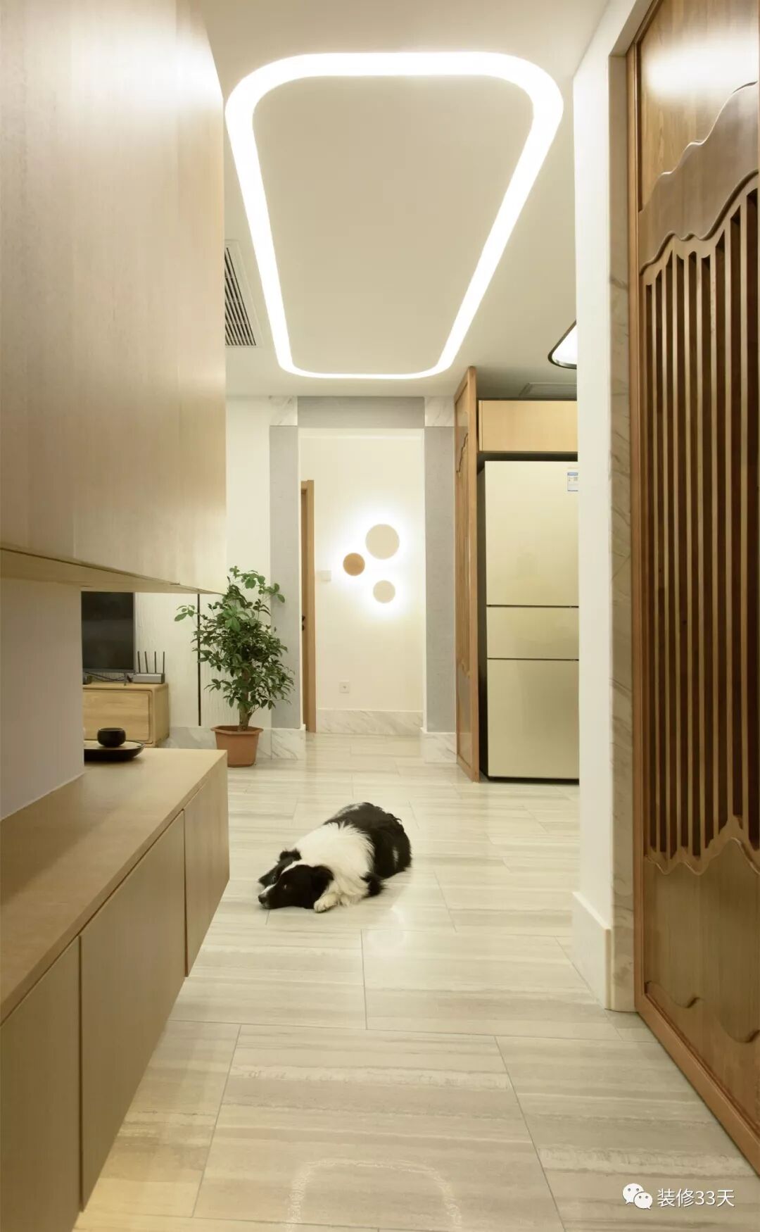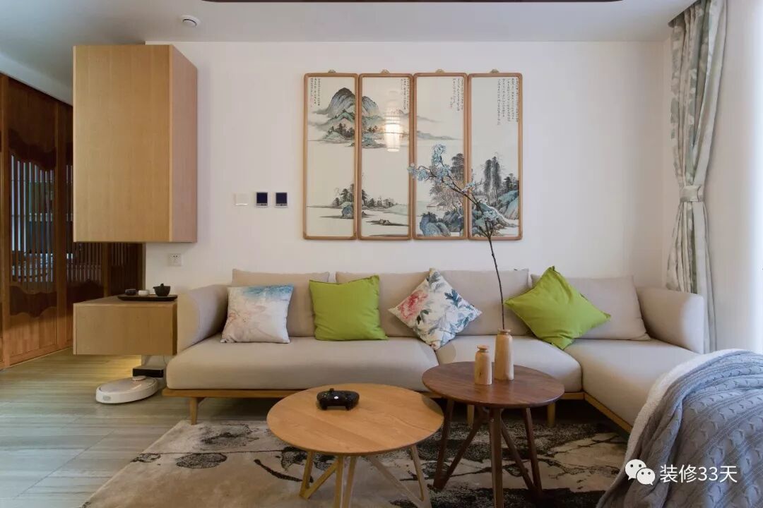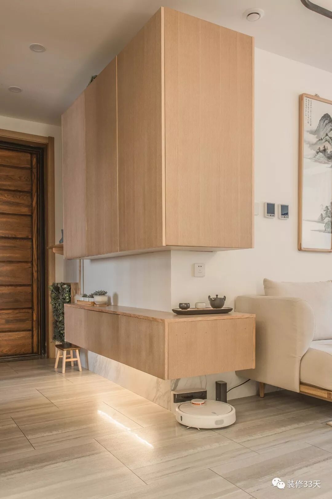 ▲ 玄关储物柜采用壁挂形式,方便扫地机器人活动,吊柜位置与沙发背景挂画保持一致