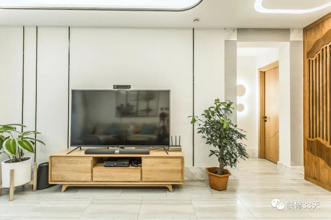 ▲ 采用手工硅藻泥和不锈钢条打造电视背景,加高石材踢脚线显空间大气