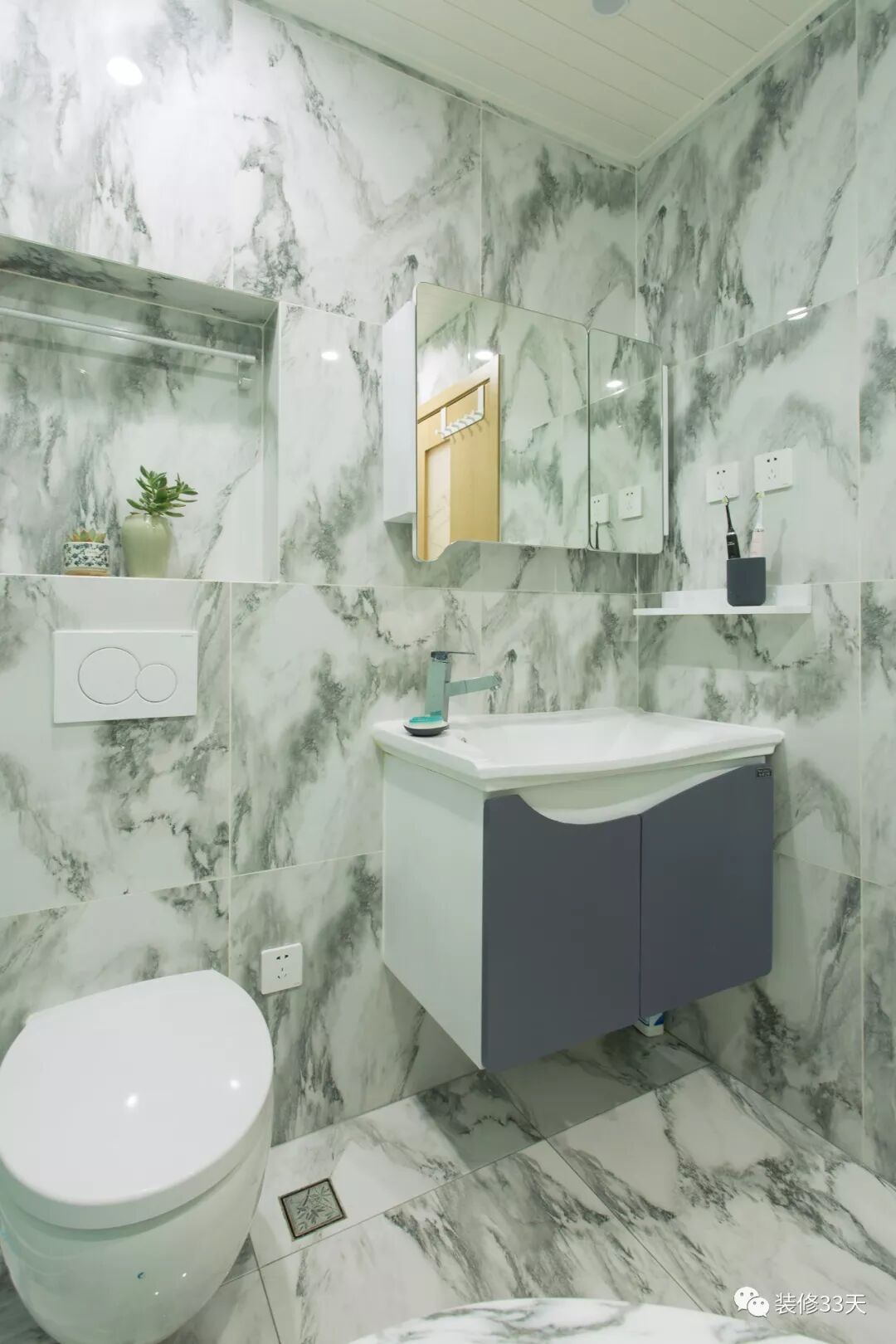 ▲ 卫生间通铺仿石瓷砖,呈现山水纹样,壁挂式马桶后方设置成壁龛方便置物