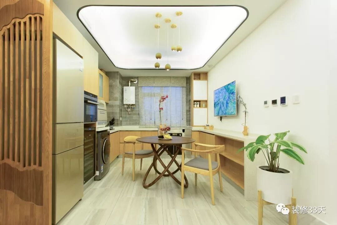▲ 将餐厨合一,木色定制橱柜留出大型厨电以及洗衣机的位置,设计功能齐全