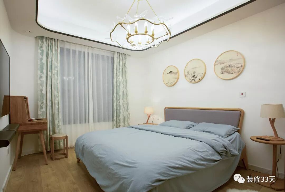 ▲ 主卧地面通铺木地板,延续留白墙面点缀三幅圆画作背景,实用的木色家具搭配小鸟吊灯,温馨舒适
