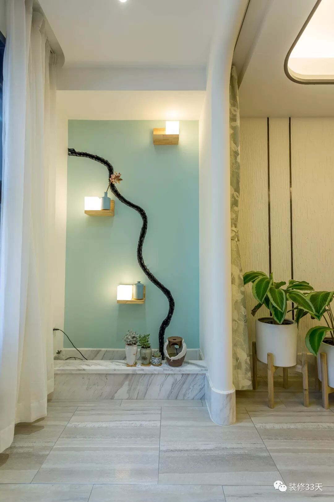 ▲ 在阳台打造室内水系花房,蓝色背景搭配木色与暖光,美观仙气