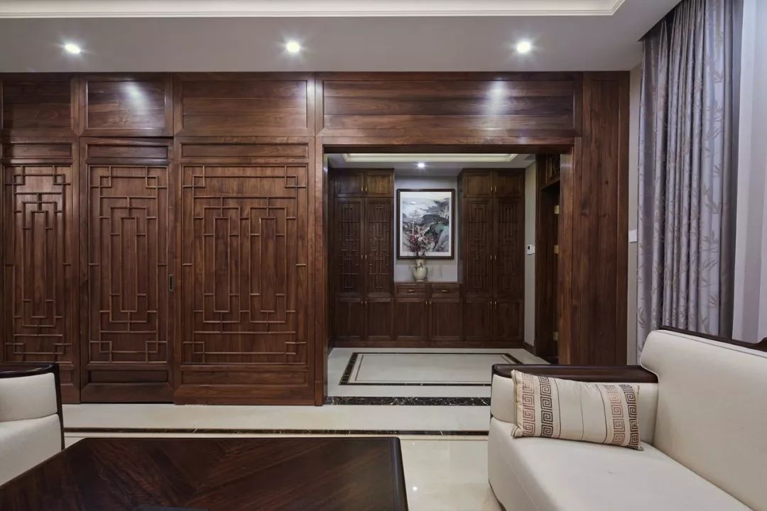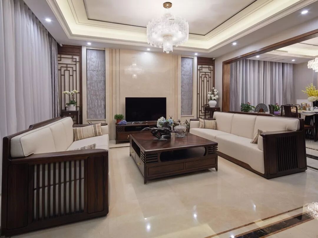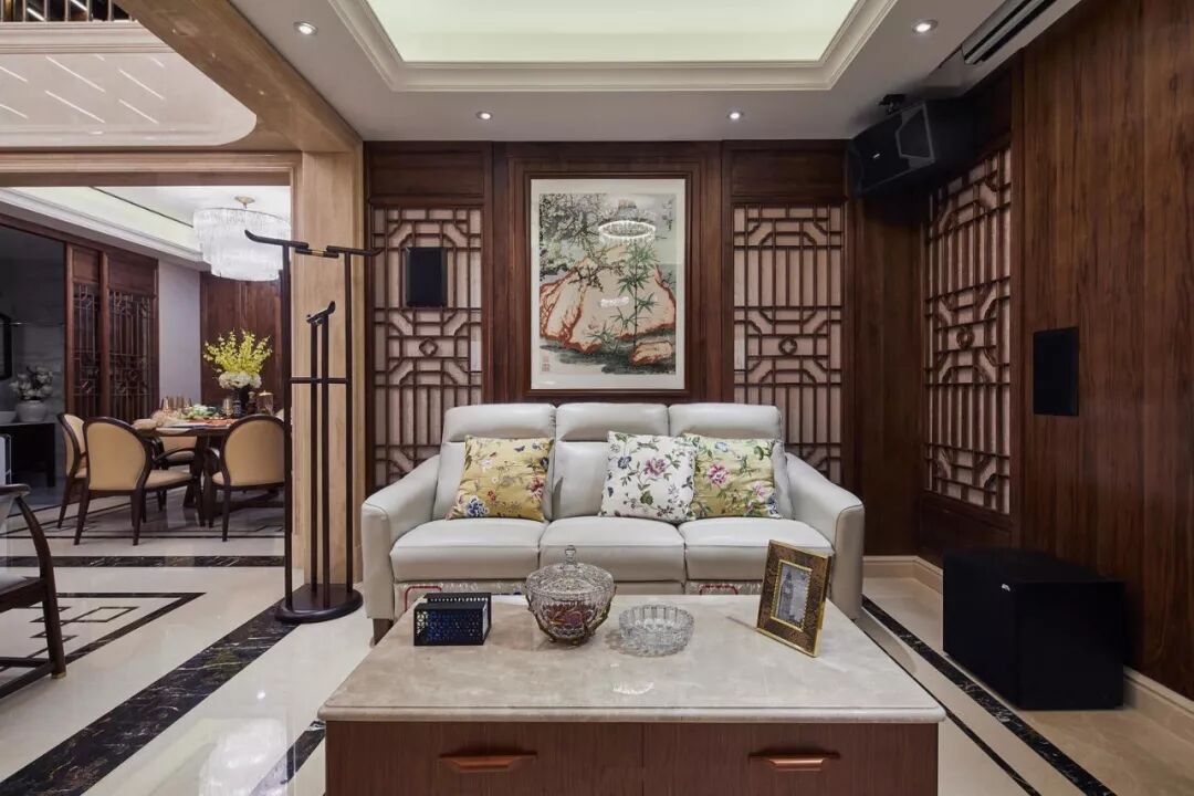 本案在装饰的细节部分崇尚自然情趣,通过精雕细琢的工艺和富有变化的造型,充分体现出中国传统美学中的独特韵味。客厅选择围合式,同时特意强化了线条和主吊灯、射灯的配合应用,从而营造出层次丰富块面感,烘托家的温馨氛围。