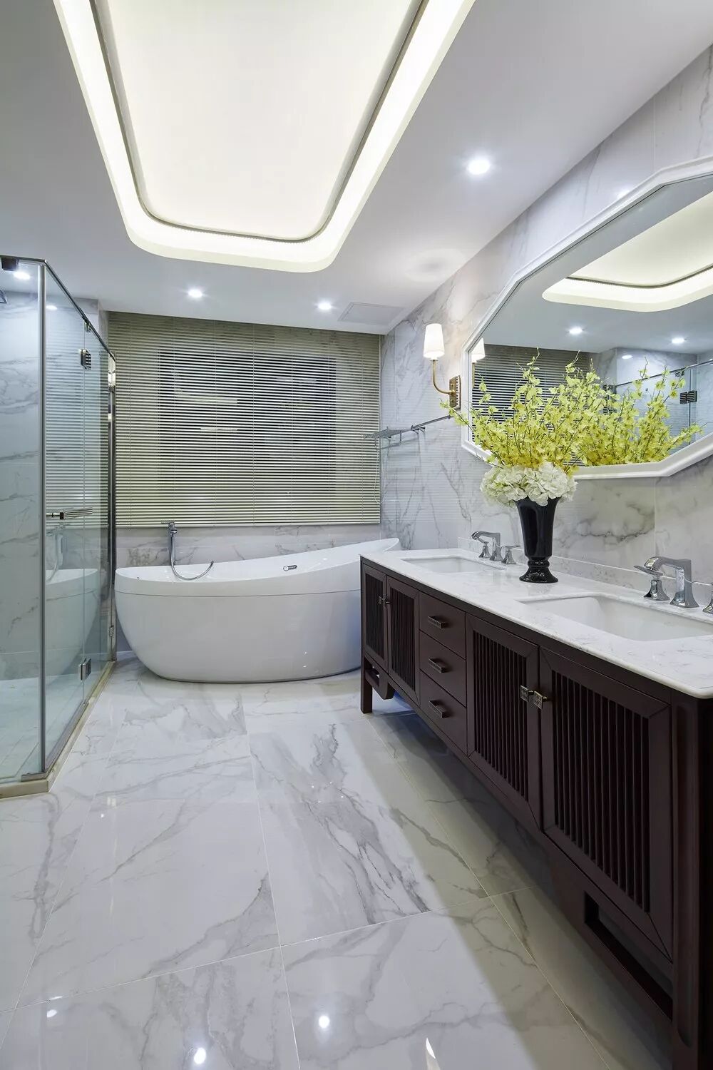 另一个卫浴间由大理石的自然肌理凸显高品质感,地面与墙面的统一,串联起一致的艺术视像,实现空间的优雅、精致、整洁、自然。人在此间,于自然的诗意中,觅得身心的放松与灵魂的舒张。