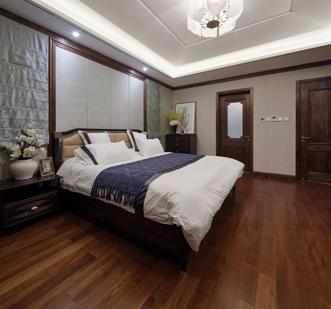 卧室床头背景墙选择极其素净的自然纹理,让人时刻感受自然的气息,衍生出一种宁静超然的意境,同时以明确的分隔,增添了空间的层次感。利用造型柔美的灯具,增加空间温润灵动的尺度感。