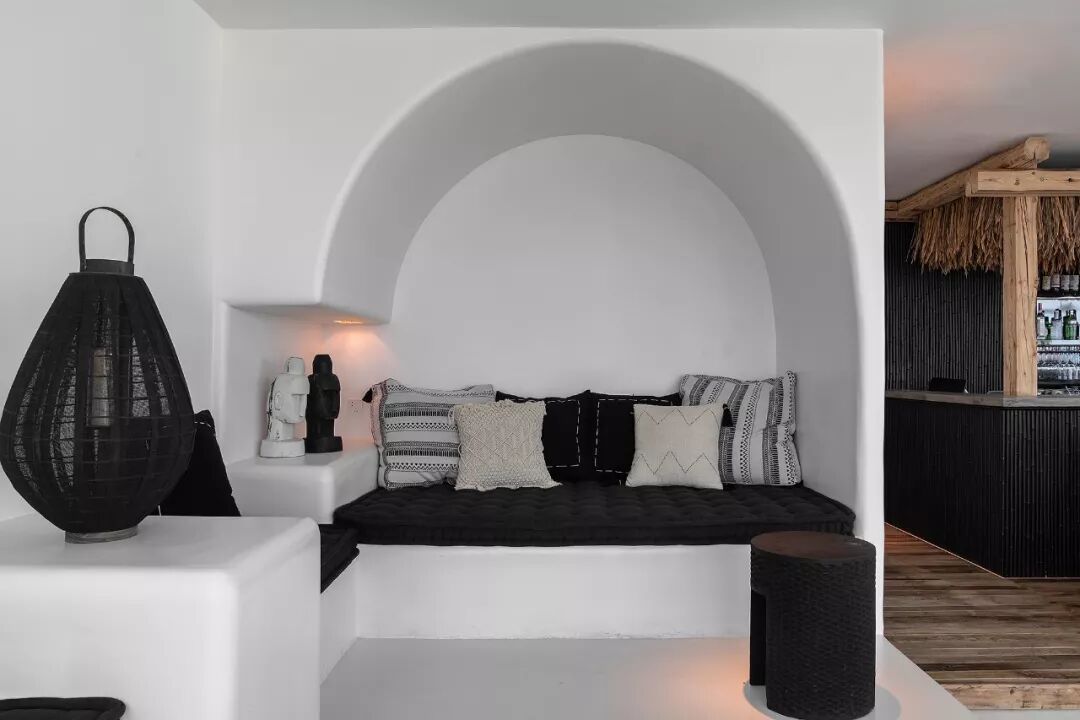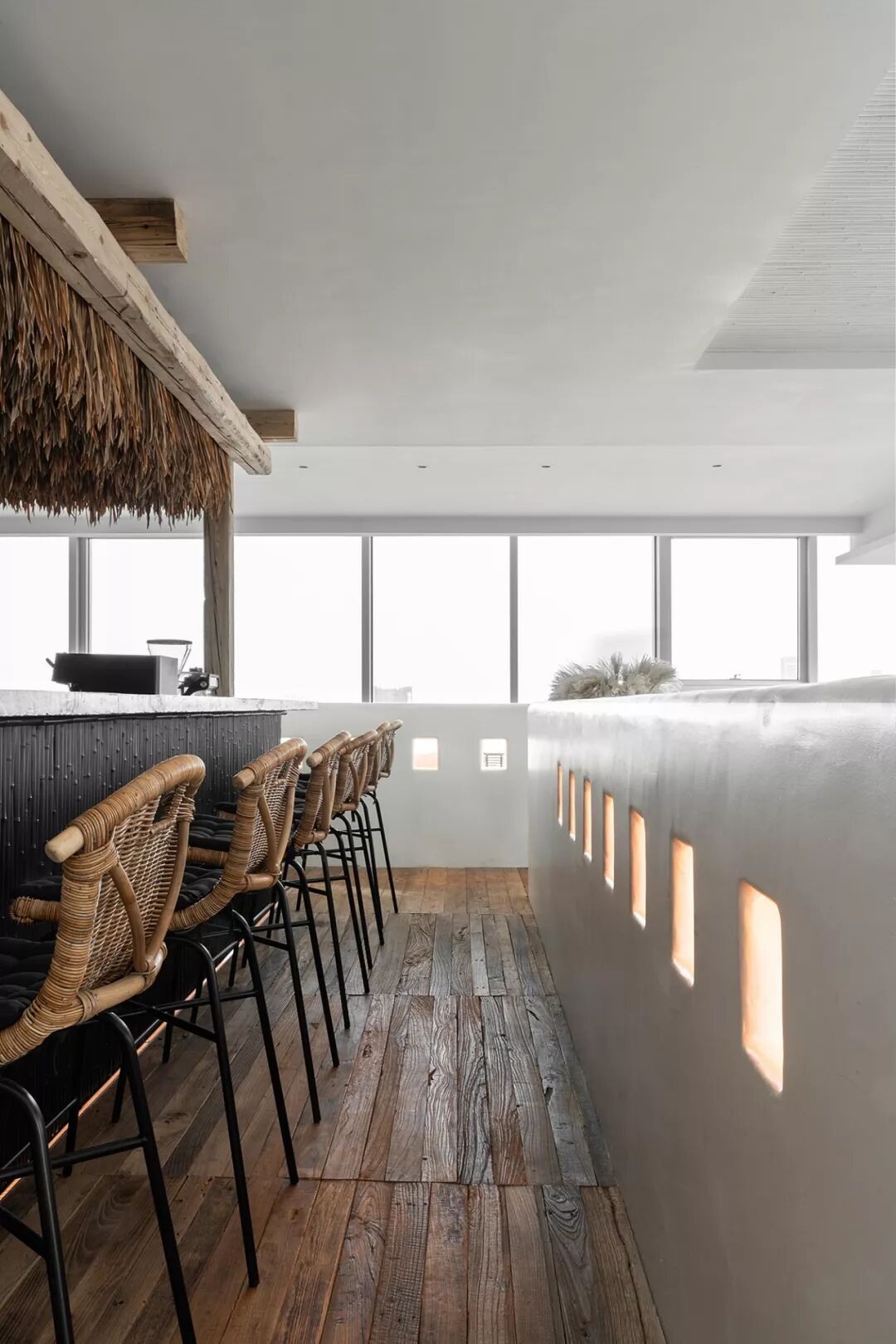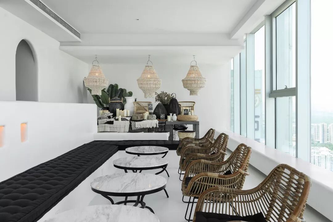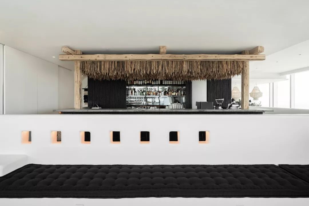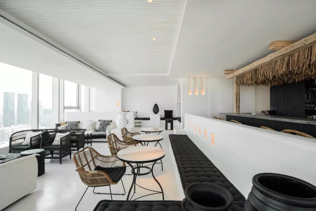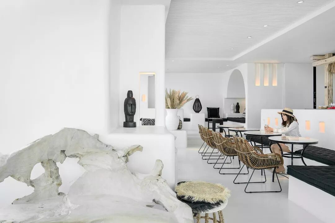 利用没有锋利边缘的白墙,藏在墙中柔和的灯光,以及竹子稻草等自然的材质,让整体减少工业社会的痕迹。并减少颜色和材质的种类,增加了空间的质朴感,使人忽觉身居于一间海边的茅草屋。