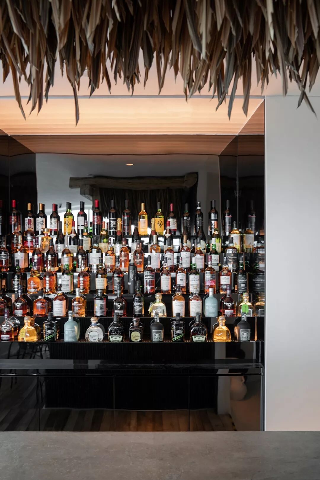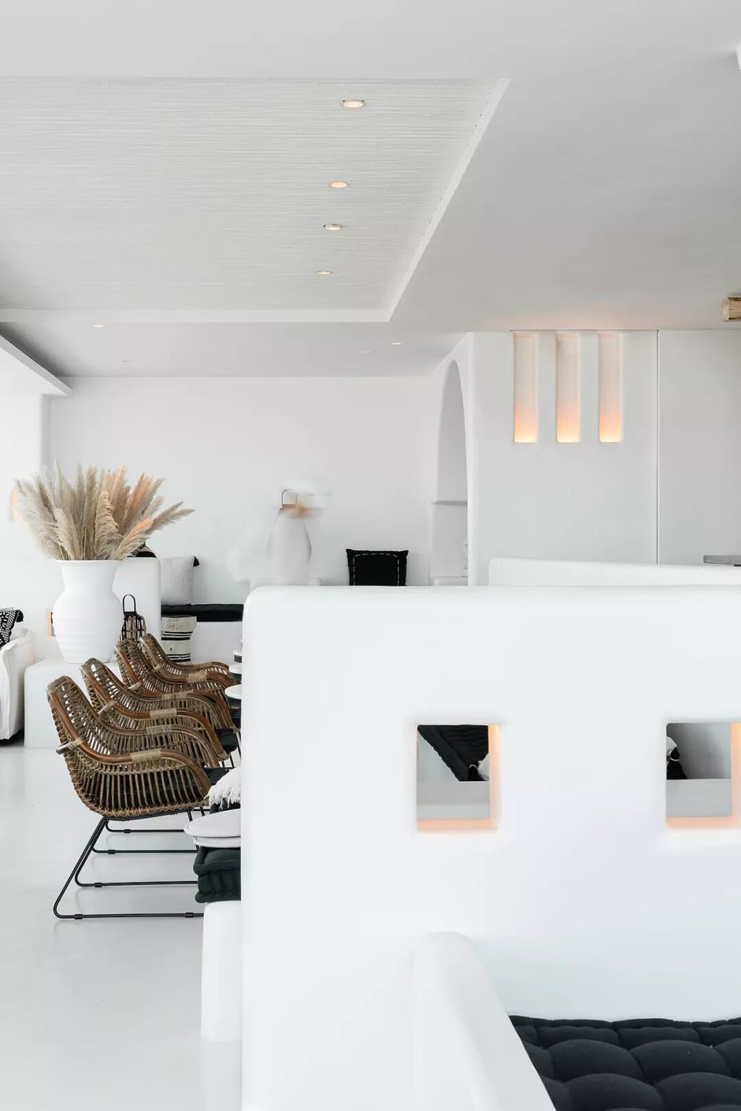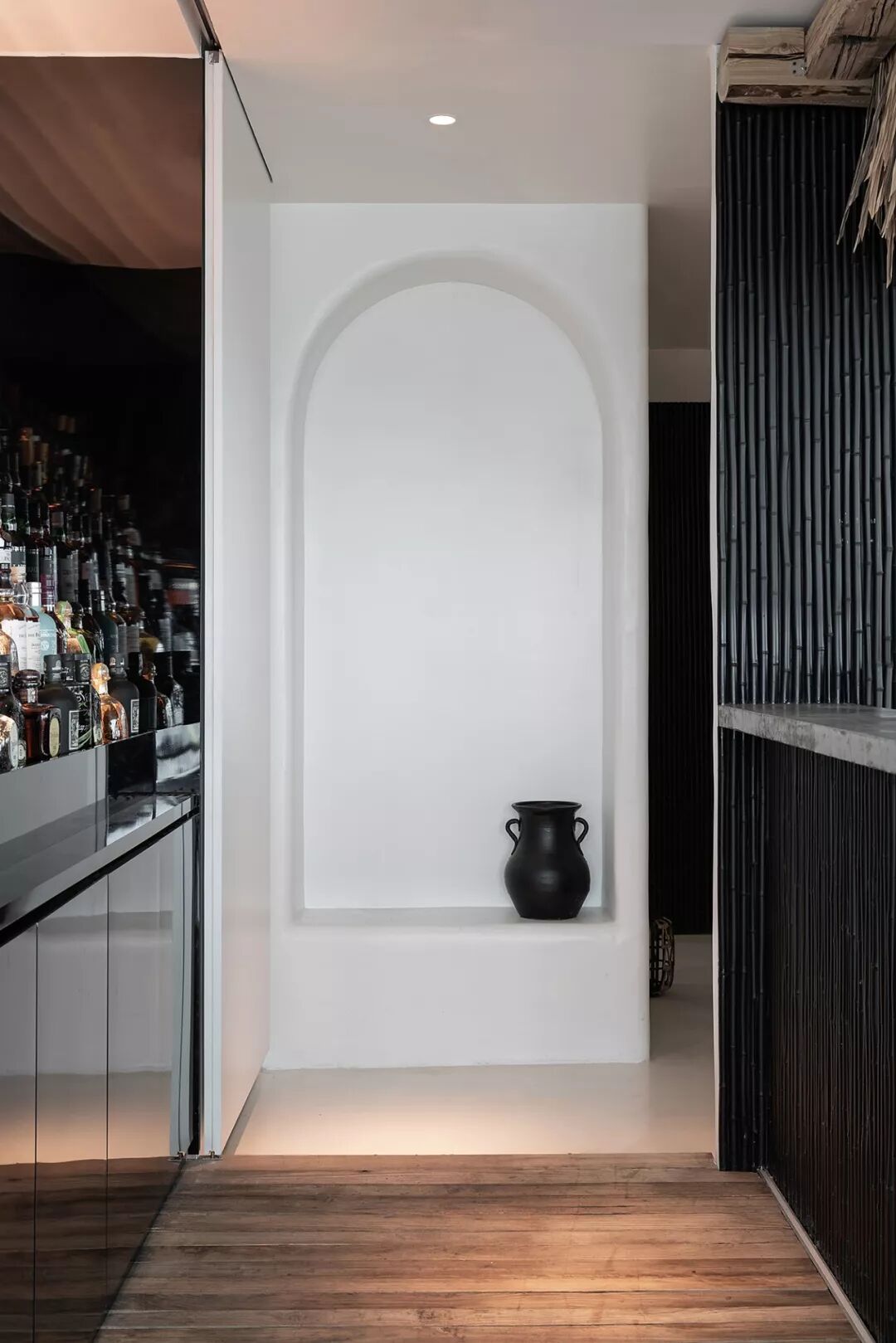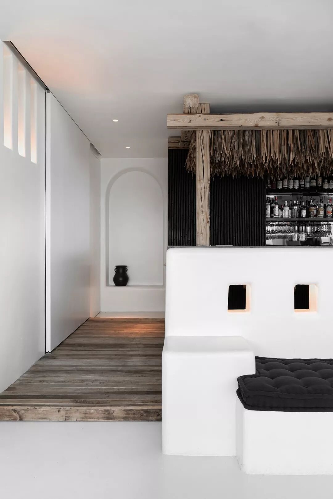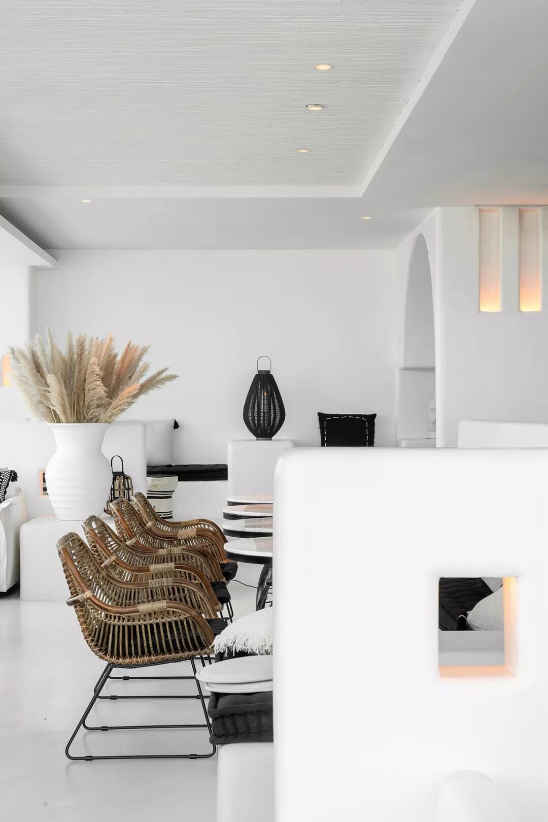利用没有锋利边缘的白墙,藏在墙中柔和的灯光,以及竹子稻草等自然的材质,让整体减少工业社会的痕迹。并减少颜色和材质的种类,增加了空间的质朴感,使人忽觉身居于一间海边的茅草屋。
