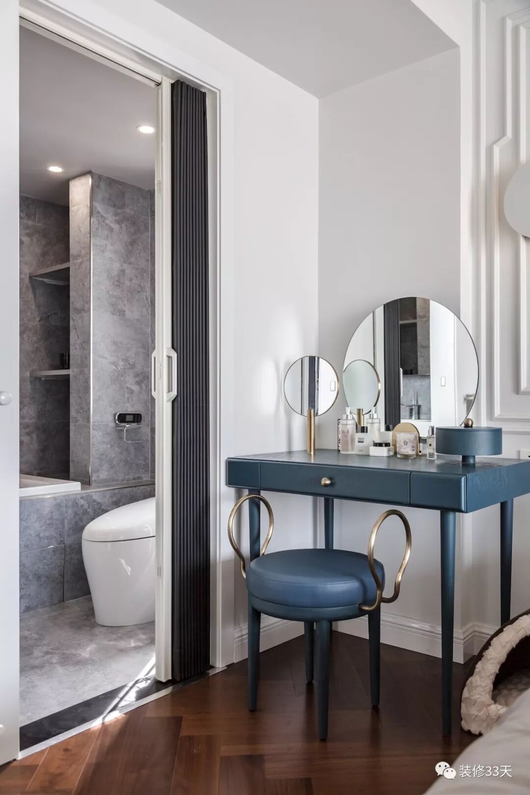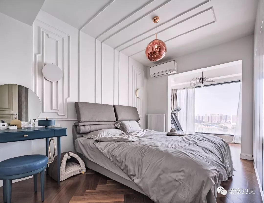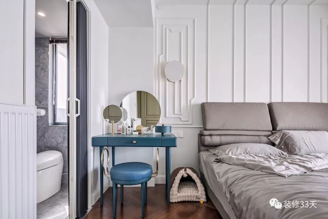 ▲ 灰色大床搭配蓝色轻奢款梳妆台,一旁是喵星人的小窝
