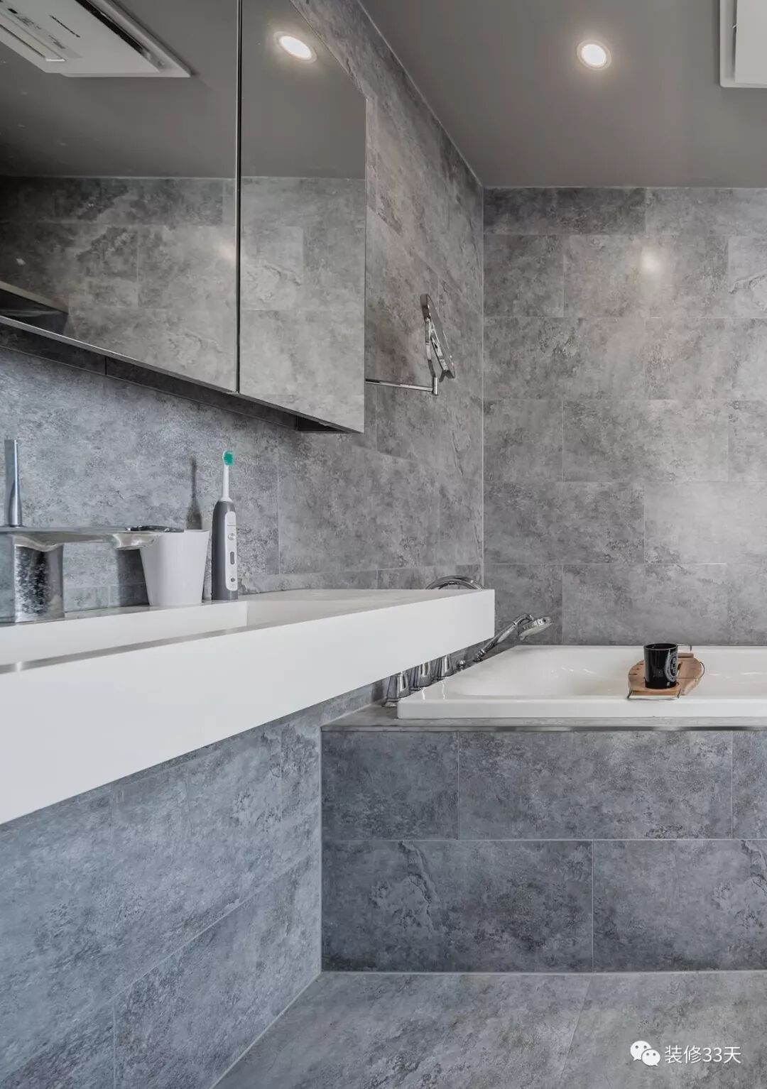▲ 主卫整体通铺灰色系仿石瓷砖,搭配灰色防潮石膏吊顶,浴缸与壁挂式洗手台,简洁实用