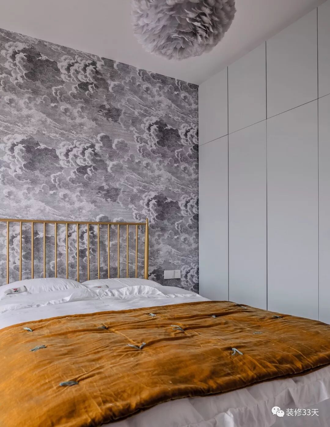 ▲ 次卧作儿童房,与公领域呼应的壁纸铺贴床背景,搭配灰色羽毛吊灯,金色床架提升色调的饱和度