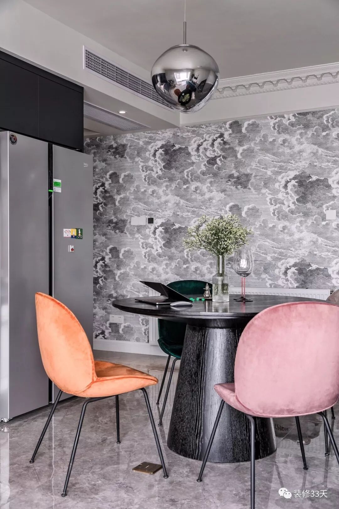 ▲ 餐厅地面延续铺贴灰色系石纹瓷砖,纹路与墙面壁纸呼应,黑色圆形餐桌与圆球形吊灯,形状呼应