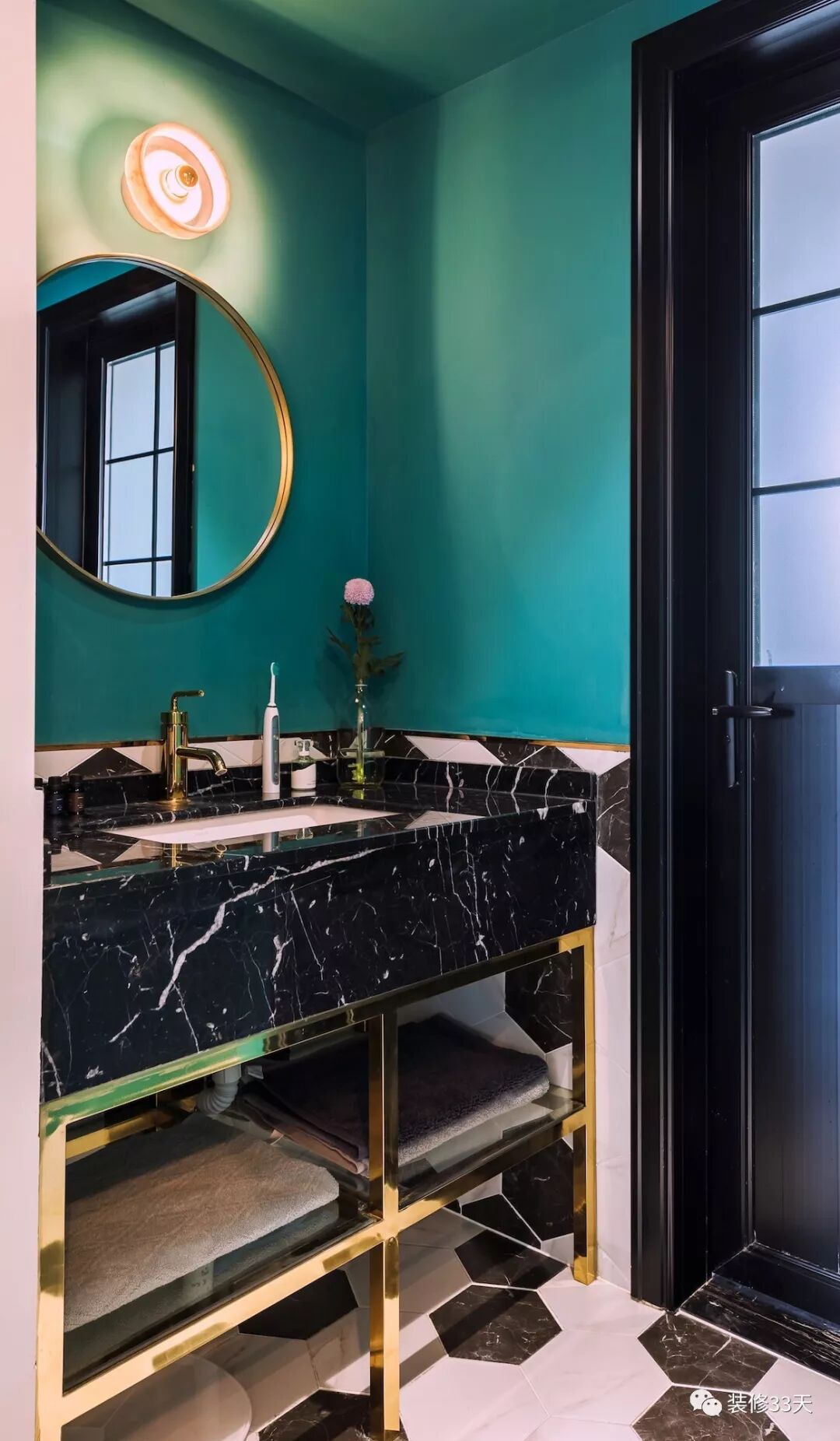 ▲ 客卫干湿分区,地面延伸至半墙铺贴拼色六边砖,搭配墨绿色卫浴漆,定制款浴室柜轻奢雅致
