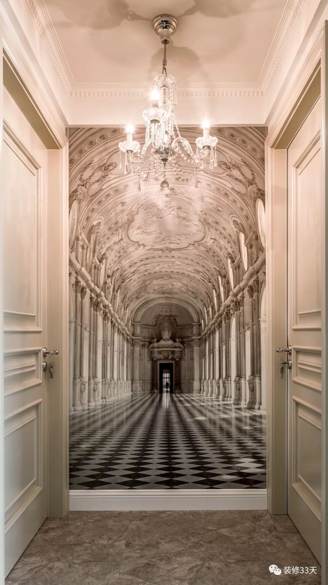 ▲ 走廊端景,选用一面增加空间刚的壁纸,视线被拉伸